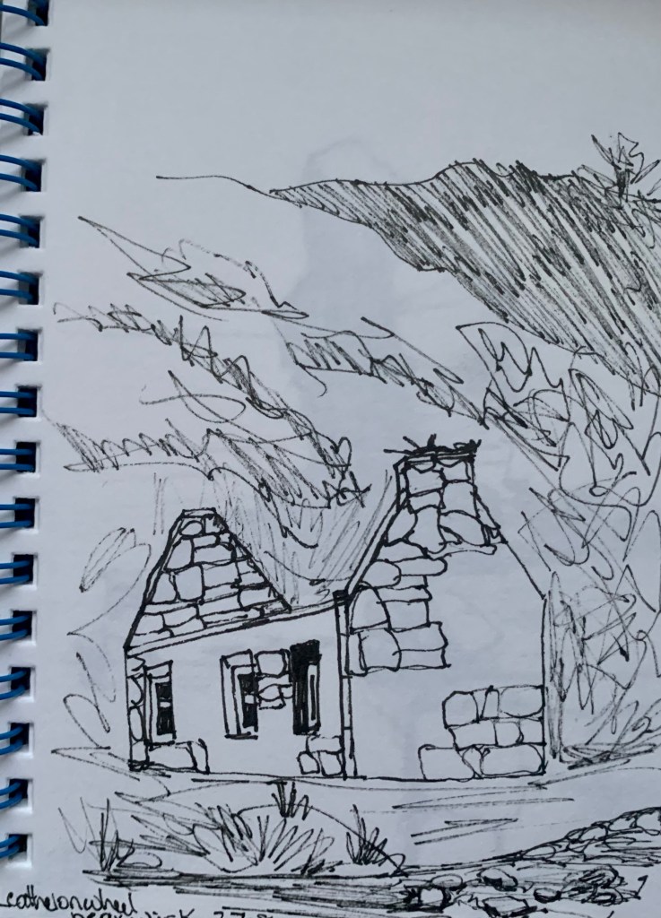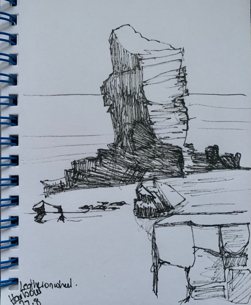 Sitting in the sun sketching the harbour wall and the rocky outcrops.