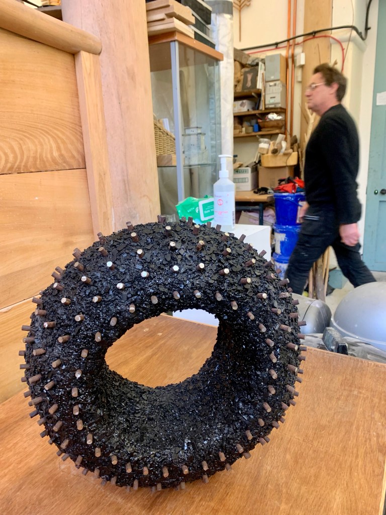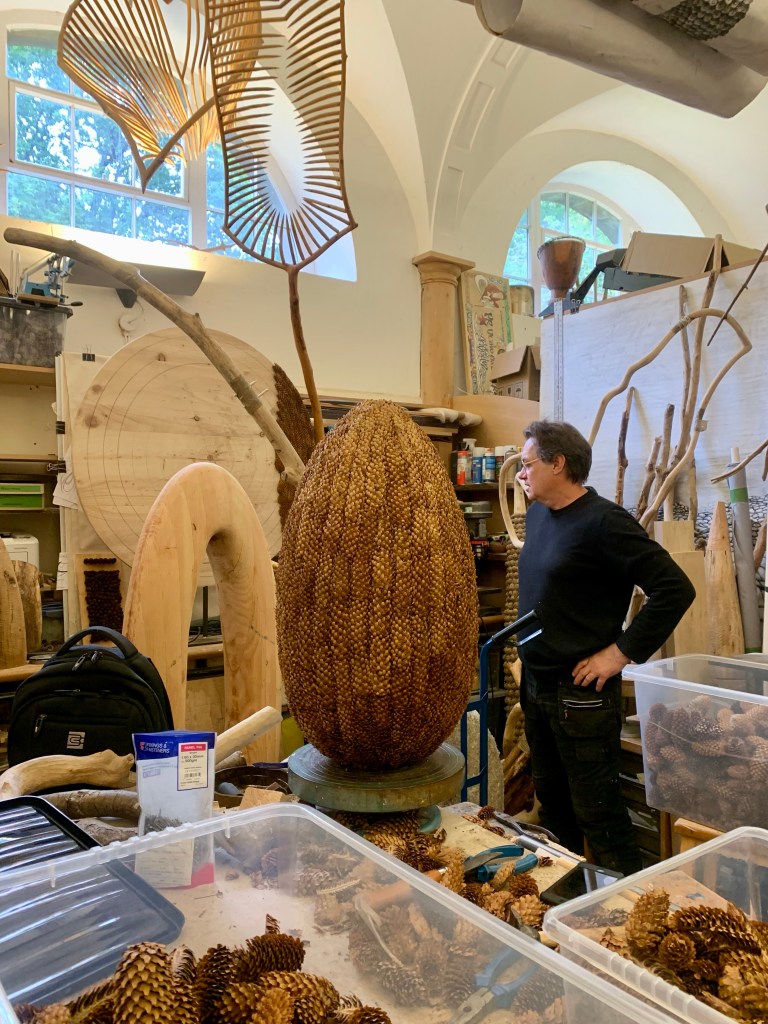 Leon explaining his process for producing his art. The egg shape in the foreground is covered with fir cones.
