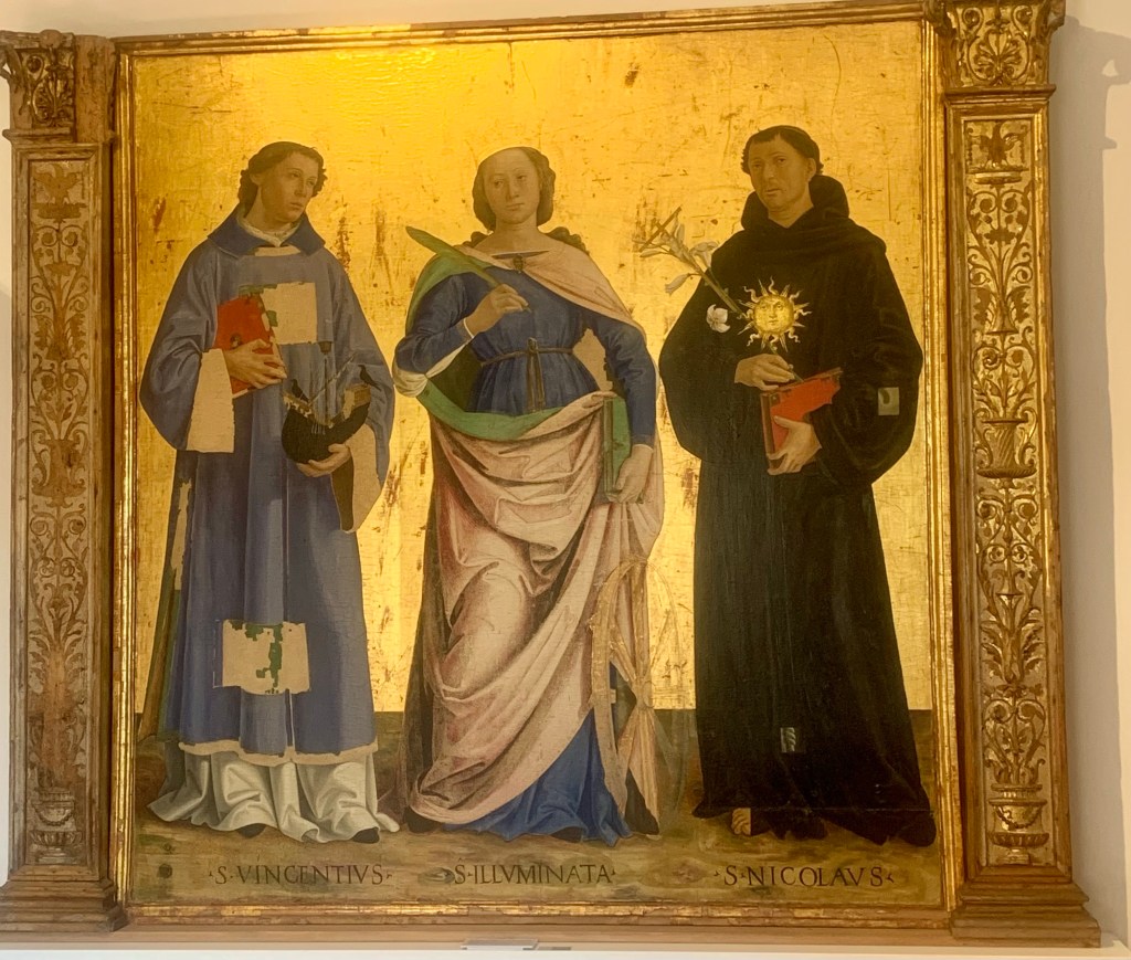 This is a piece of a fresco removed and restored onto a canvas of Saint Margaret. I like her non assuming style. I think she’s behind bars.