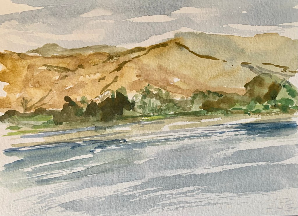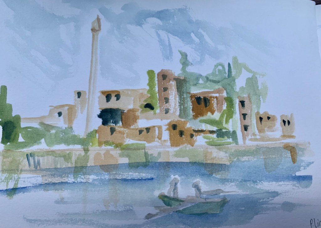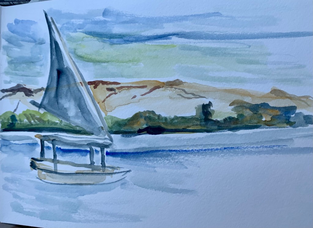 On the boat and off to Ensa which has a lock on the Nile. I’m thankful I didn’t need to open those gates. Had time to sketch and paint as we cruised towards Luxor.