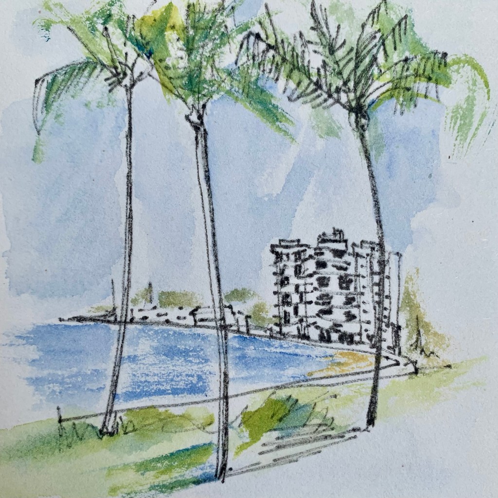 We used this time to visit family in Australia. One lovely day in Townsville I sketched the Strand. A favourite place for walkers and joggers and everyone in between.