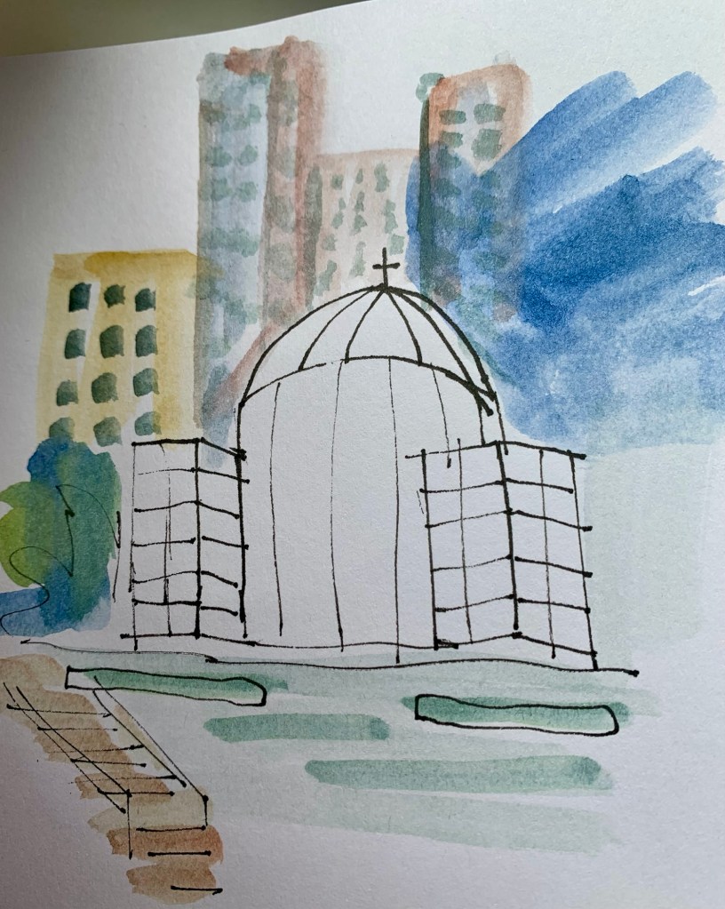 Across the street from memorial park is the Greek Orthodox Church. They couldn’t get lots of money to build a fancy building so the structure is a temporary measure. I liked the idea that the money went to the people, not a fancy building.