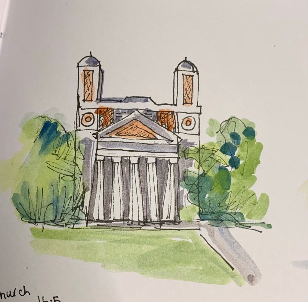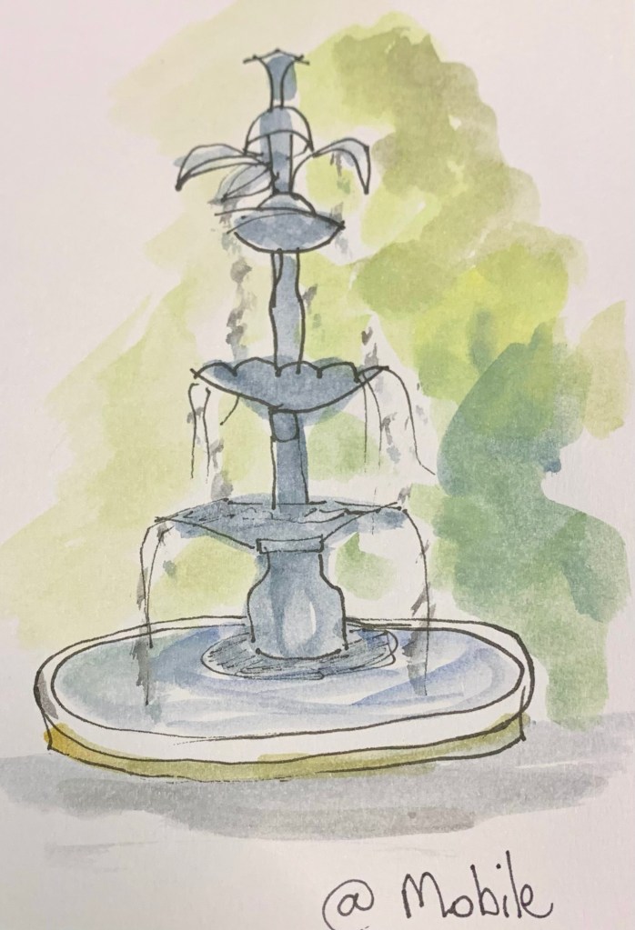 Another stop was at a city called Mobile. Nothing remarkable about Mobile either but I was inspired to draw the church and fountain in the square.