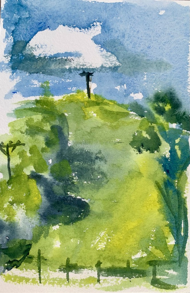 My cousin Helen, and I spent a delightful afternoon sketching my mountain and surrounding farmland. One fascinating aspect of the landscape was this property full of old buildings and broken down trucks.